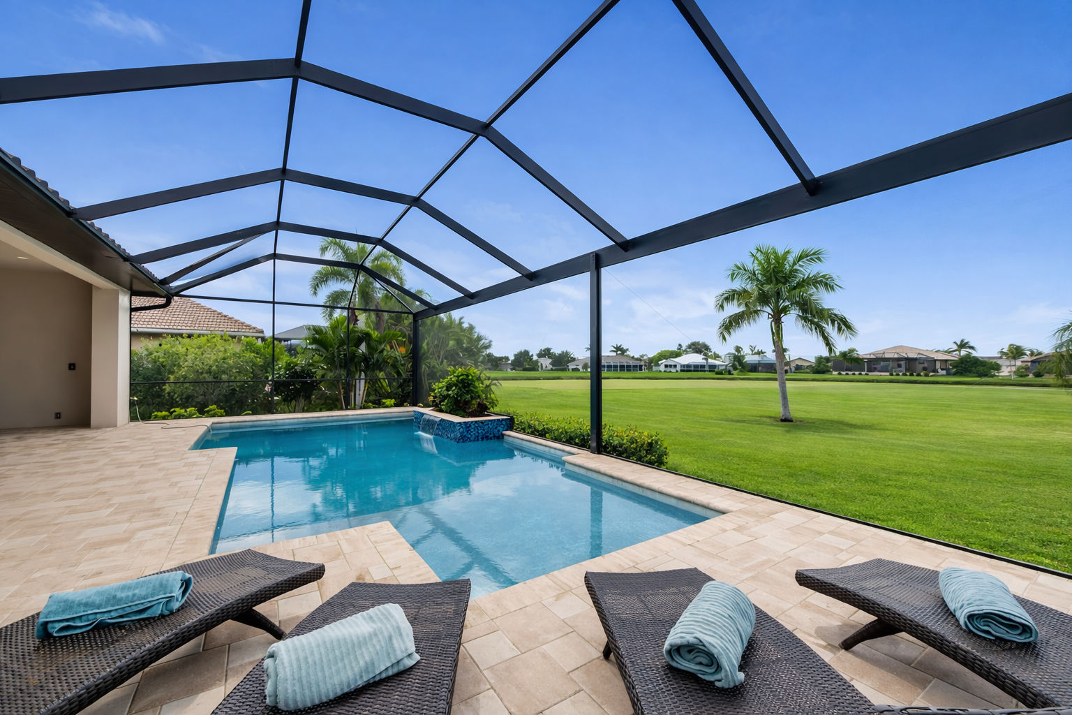 The 22 lakes of the beautifully landscaped golf course with the typical flora and fauna of Southwest Florida, with the Gulf Coast almost only a few hundred meters as the crow flies to the west, with a constant light breeze that makes even the hot summers bearable around our Villa Royal Tee a beautiful and quiet holiday atmosphere. The villa is located directly on one of these lakes, and from the outdoor area you can not only enjoy beautiful sunsets, but also grill perfect steaks and end the day with a glass of red wine. The large modern pool has electric heating.